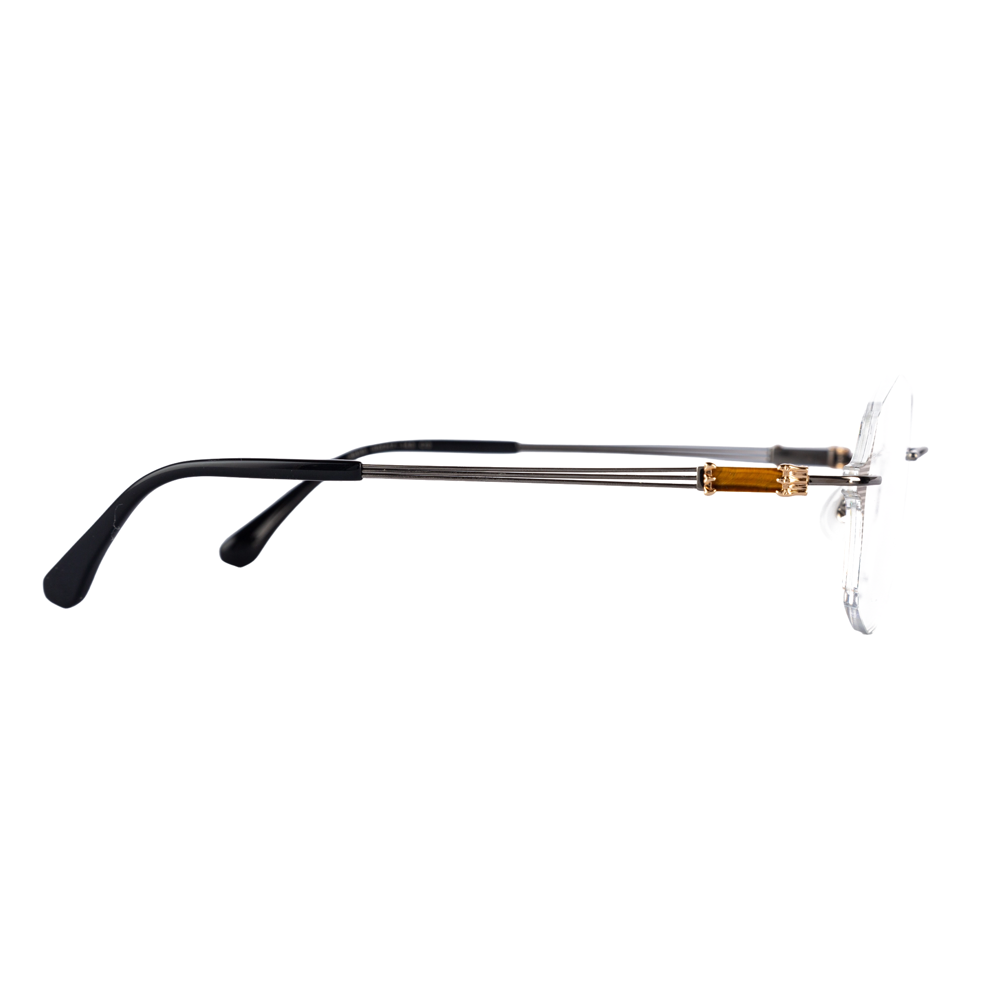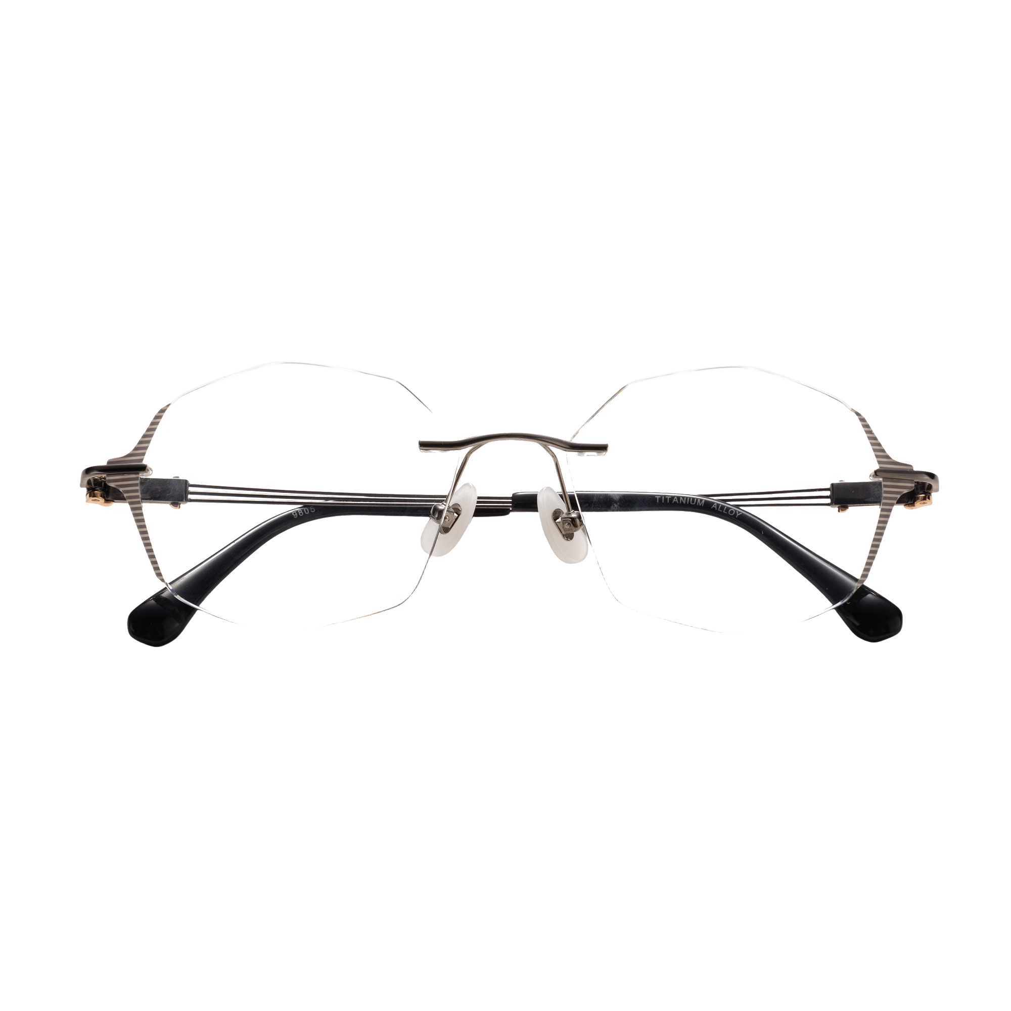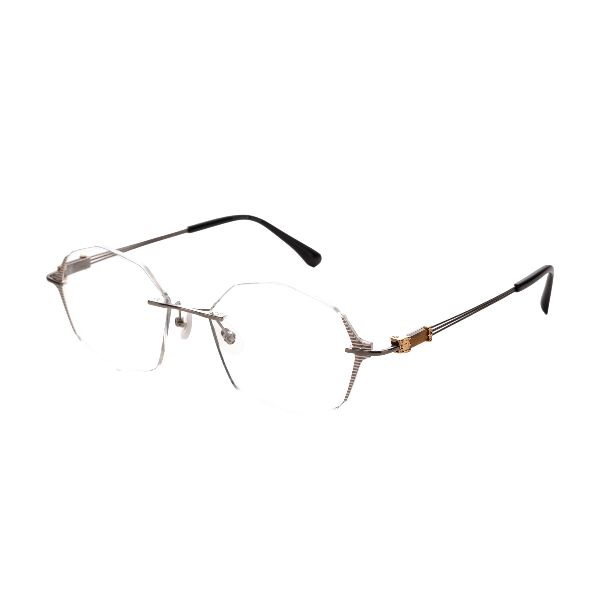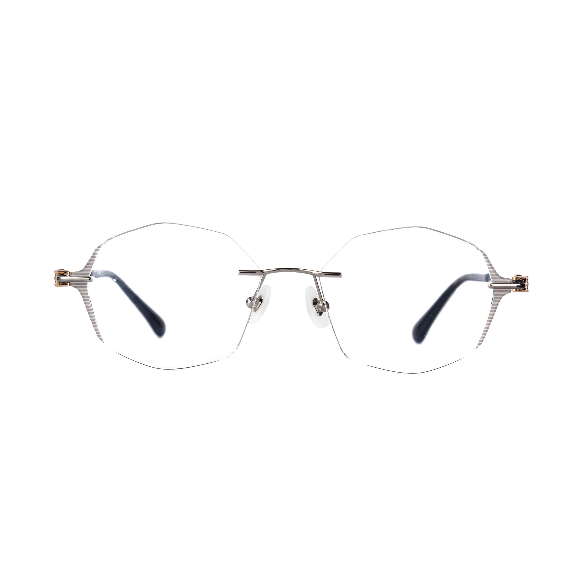The 9805-A features a silver titanium frame with a polygonal design, combined with natural jade nose pads for a comfortable fit. It includes a colored edge treatment that enhances the geometric shape and adds a modern touch.