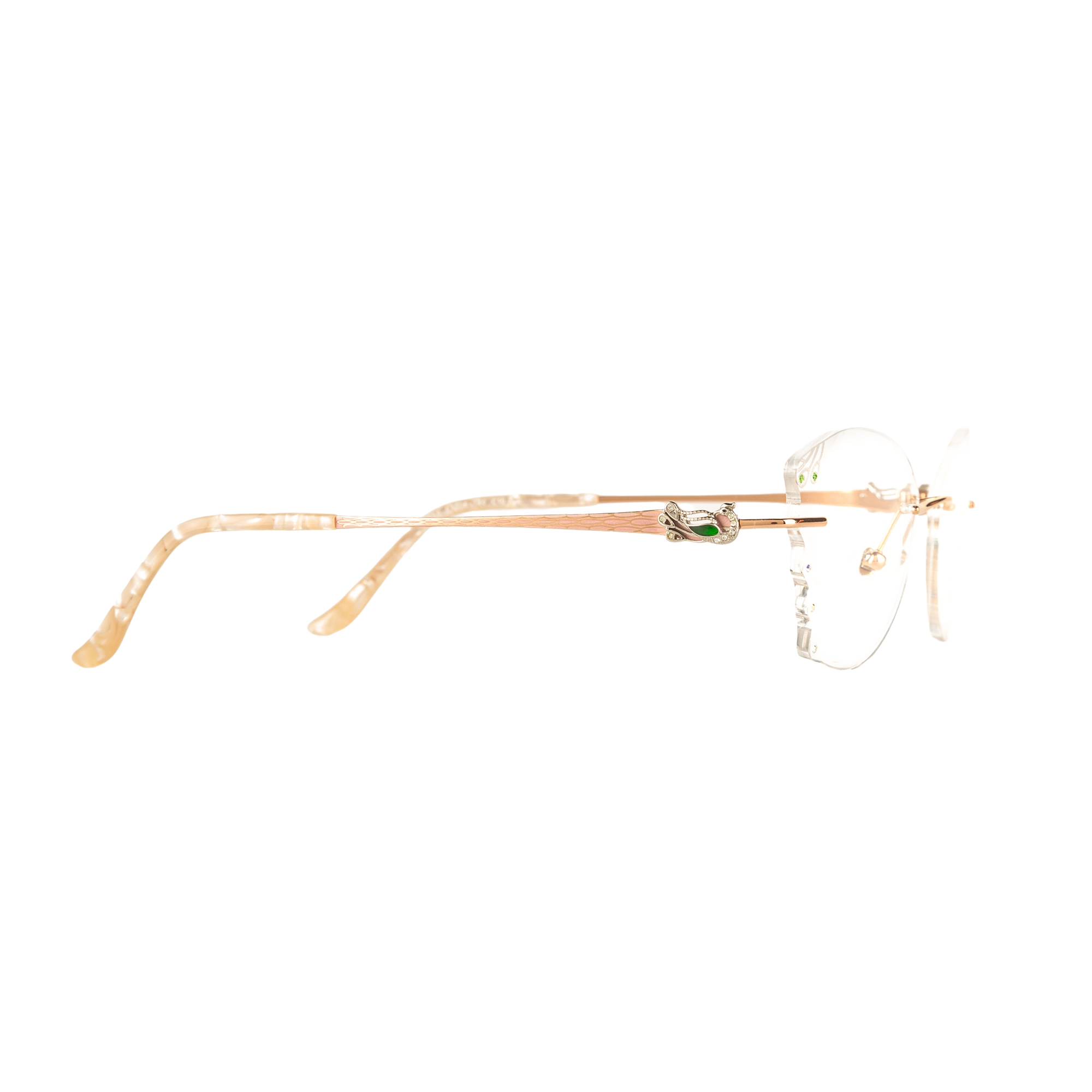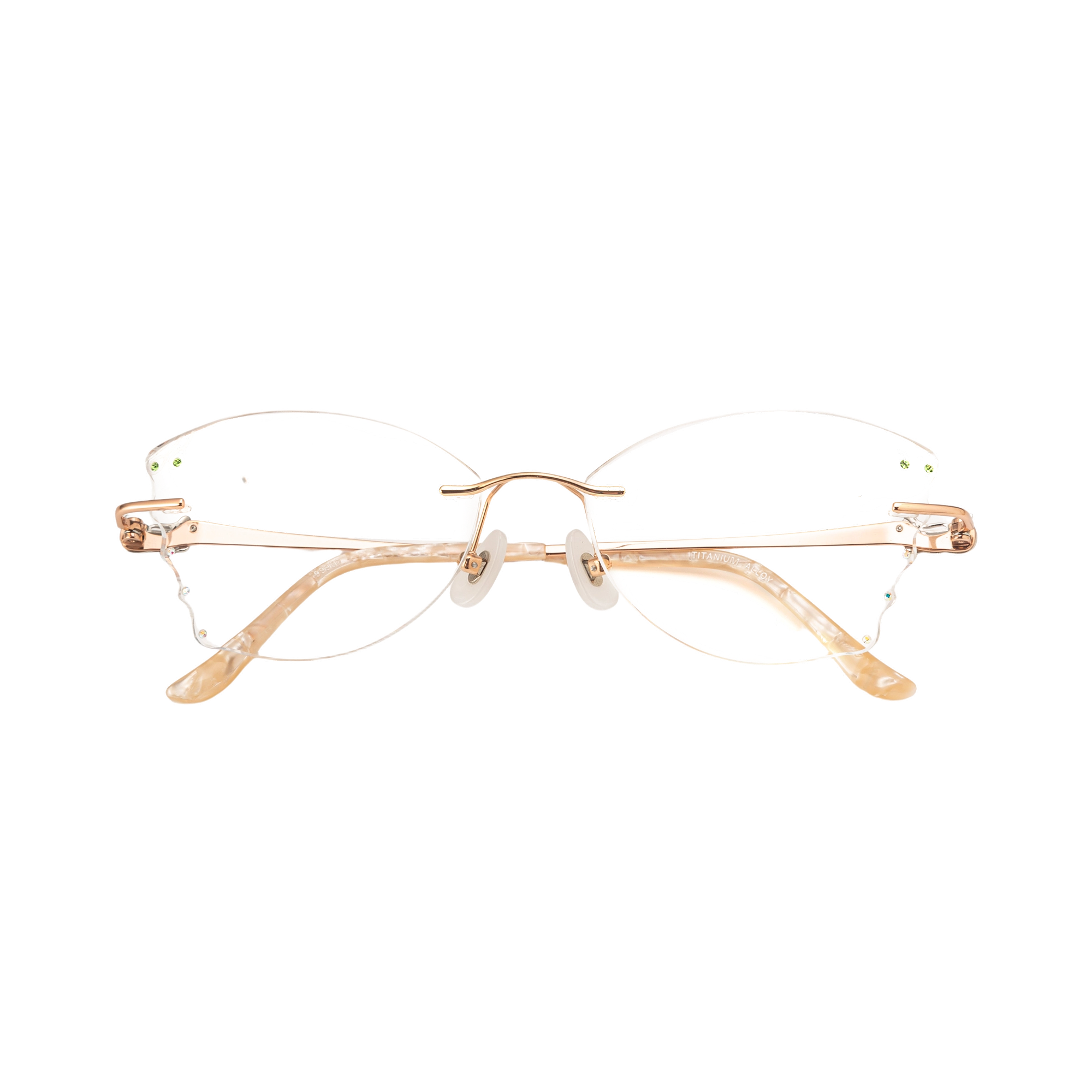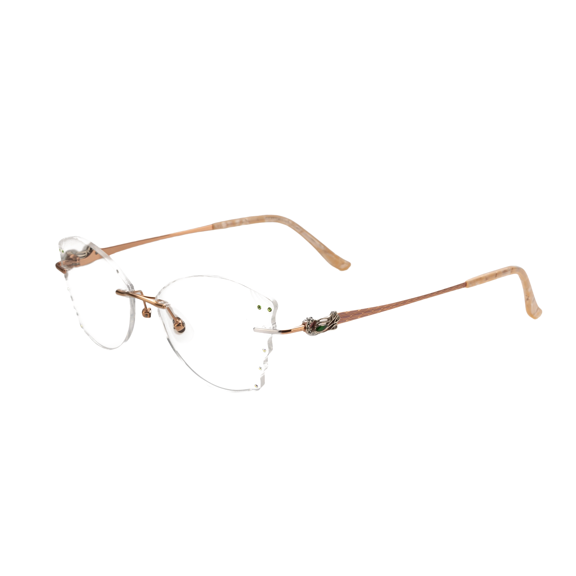 Discover Model 99950-C gold peacock rimless glasses with titanium frame and Swarovski crystals for elegant, lightweight style.