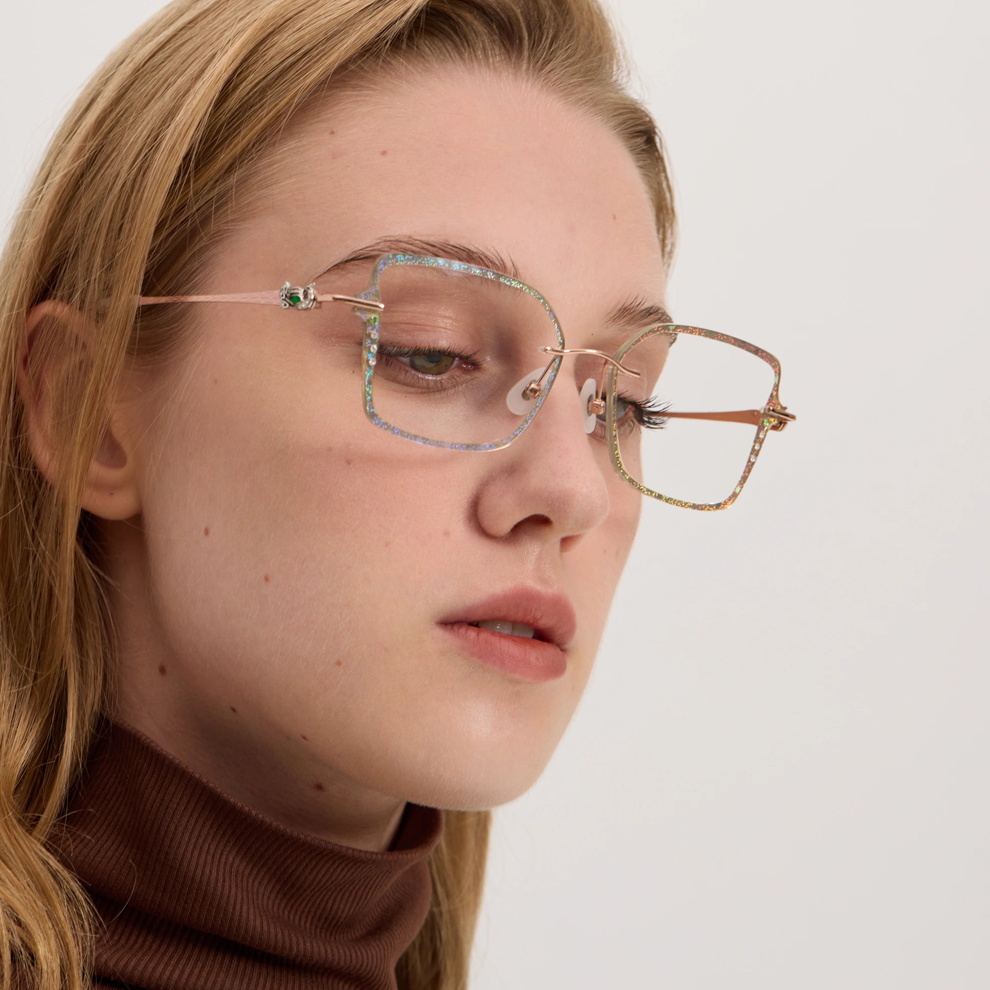 The Embedded Crystal Process incoorporates each crystal inside the lens itself. During production, the crystals are set into the lens material so they become part of its structure, not an add-on. This creates a seamless finish with little to no risk of the pieces coming loose. The crystals appear suspended within the lens, catching light from within and adding a distinctive shine that feels lasting and truly integrated into the design.