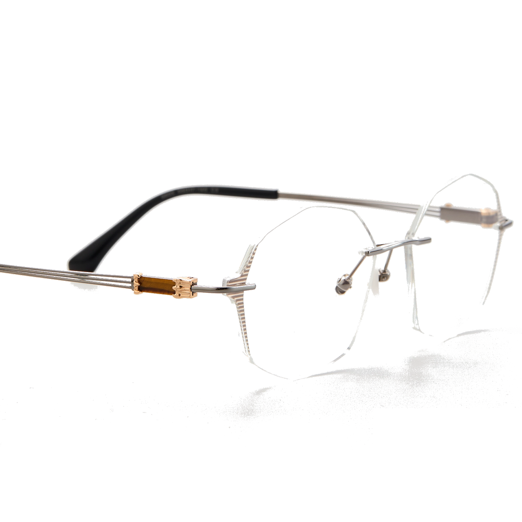 The Altis features a silver titanium frame with a polygonal design, combined with natural jade nose pads for a comfortable fit. It includes a colored edge treatment that enhances the geometric shape and adds a modern touch.